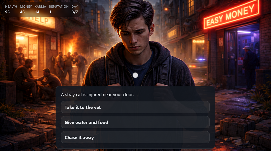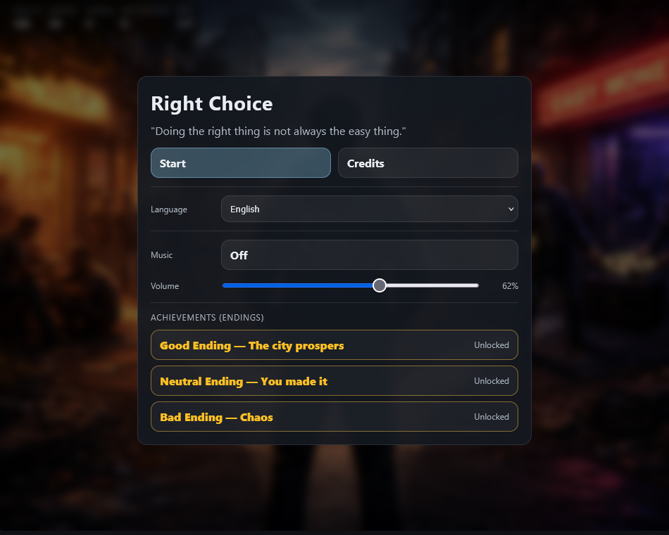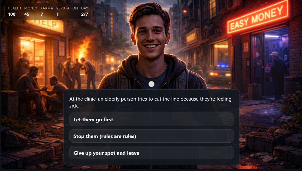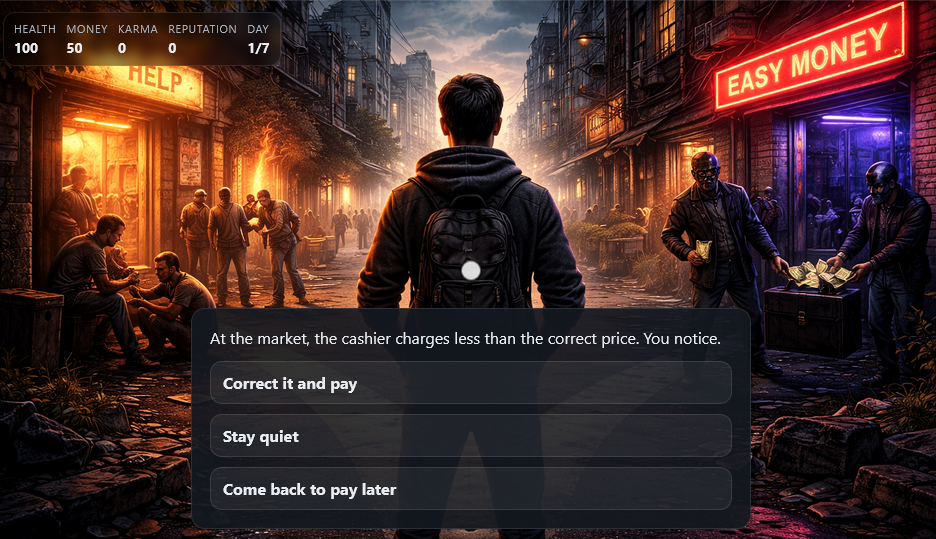 Right Choice is an interactive fiction experience built around difficult moral decisions. Each day presents new situations — some urgent, some subtle — forcing you to choose between personal gain, self-sacrifice, or indifference.