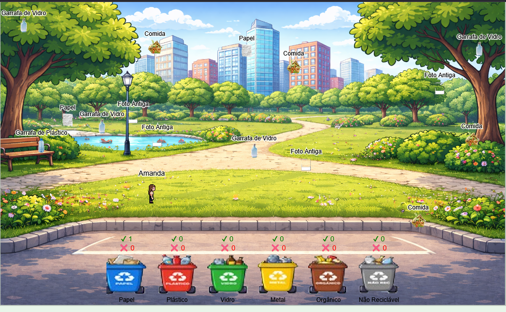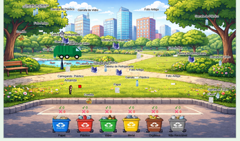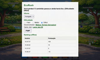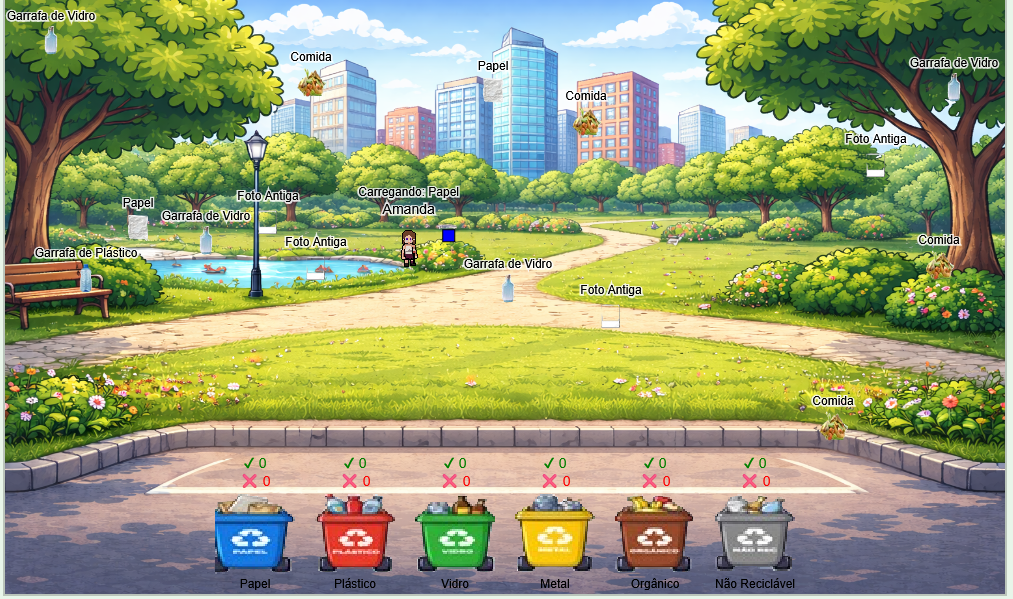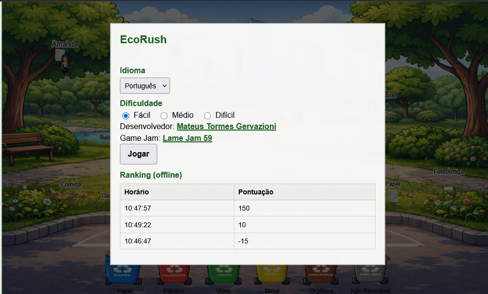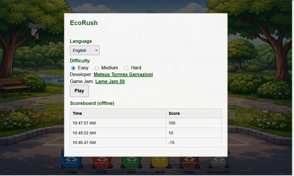 EcoRush is a 2D arcade recycling game where you must collect trash around the city and place it in the correct colored bins.